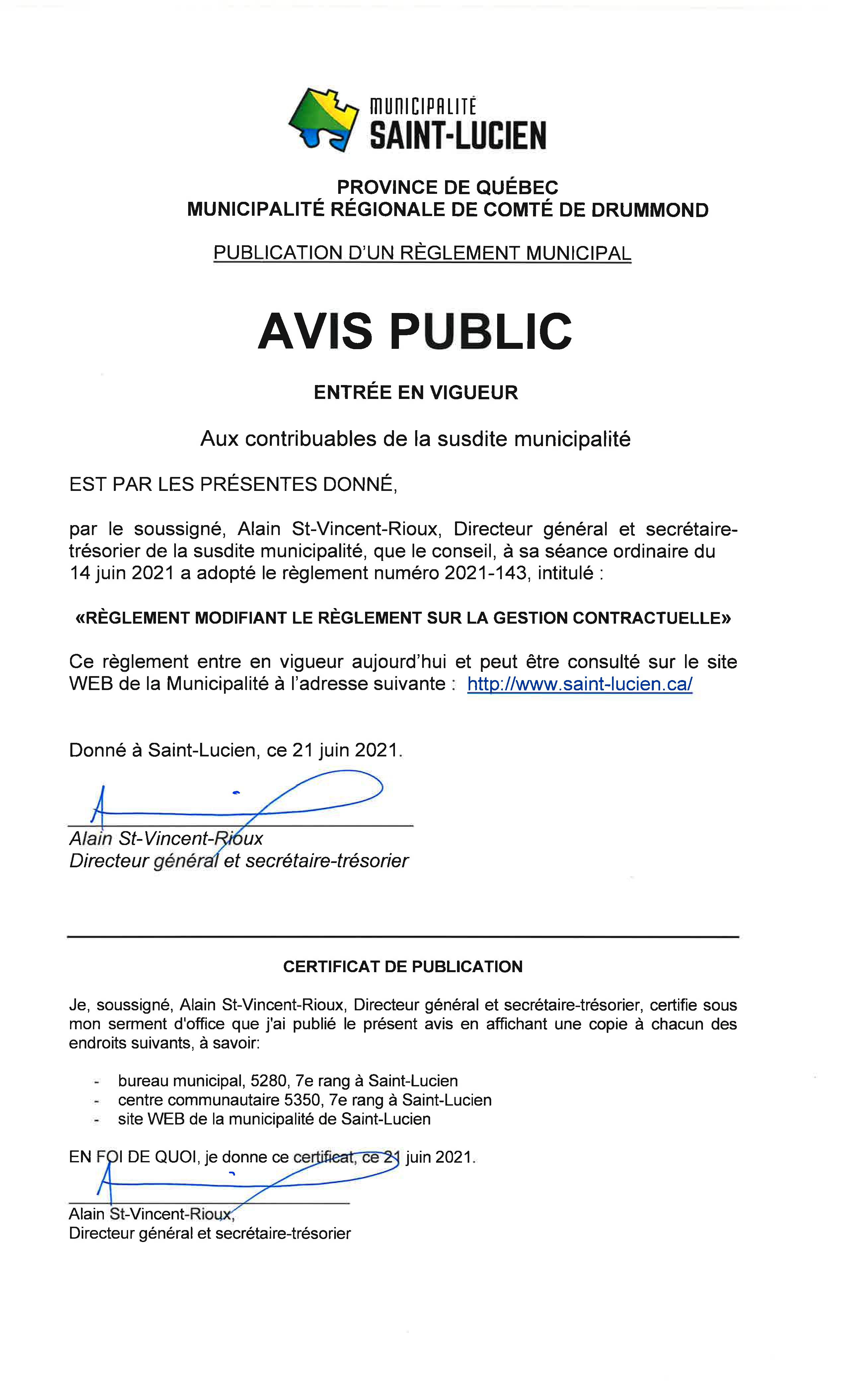 Règlement numéro 2021-143 modifiant le règlement sur la gestion contractuelle . Voir section "Règlements municipaux".