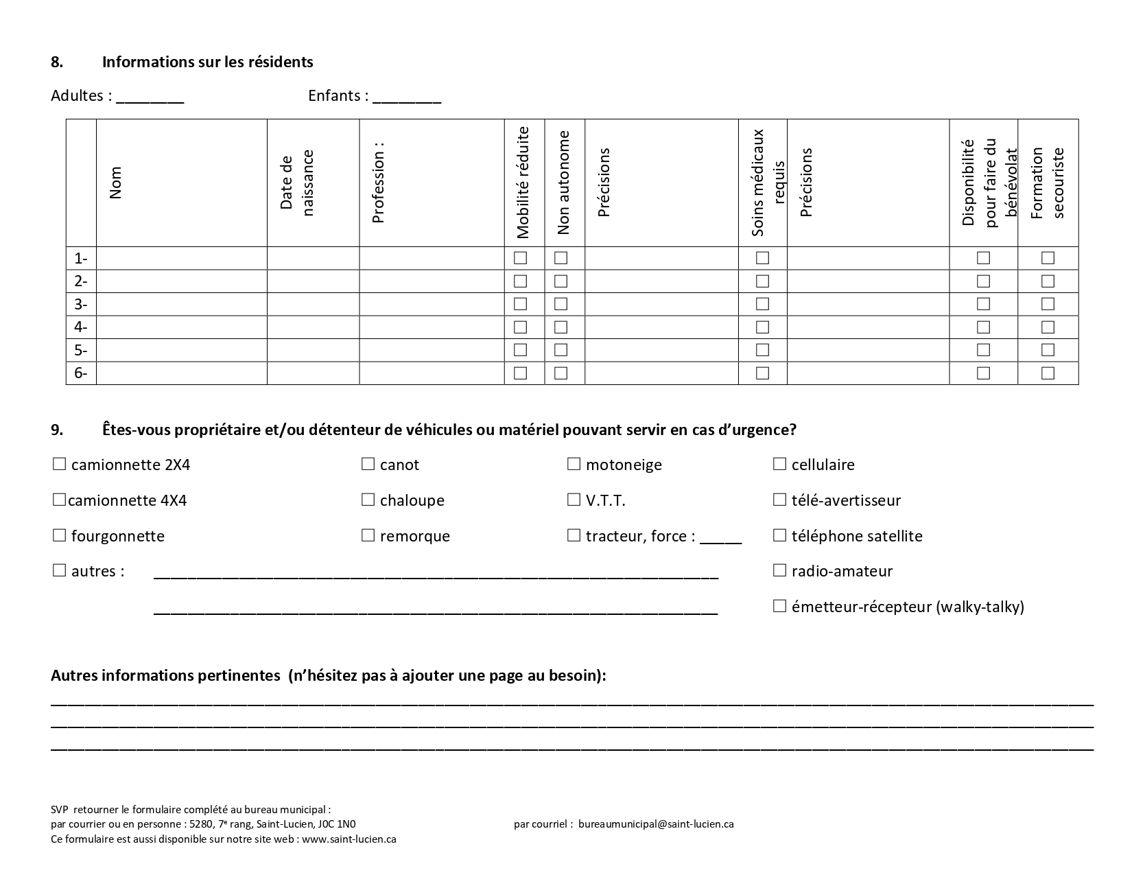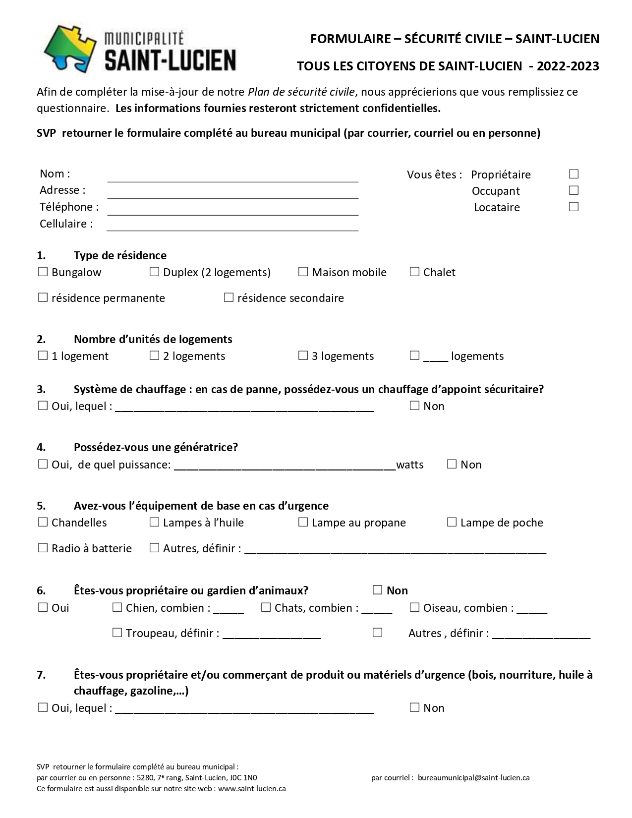 SVP lors de déménagement, veuillez compléter le formulaire ici et nous le faire parvenir à l'adresse courriel bureaumunicipal@saint-lucien.ca, ou par télécopieur au 819-397-2732 ou apporter le directement au bureau municipal au 5280, 7e Rang à Saint-Lucien.
