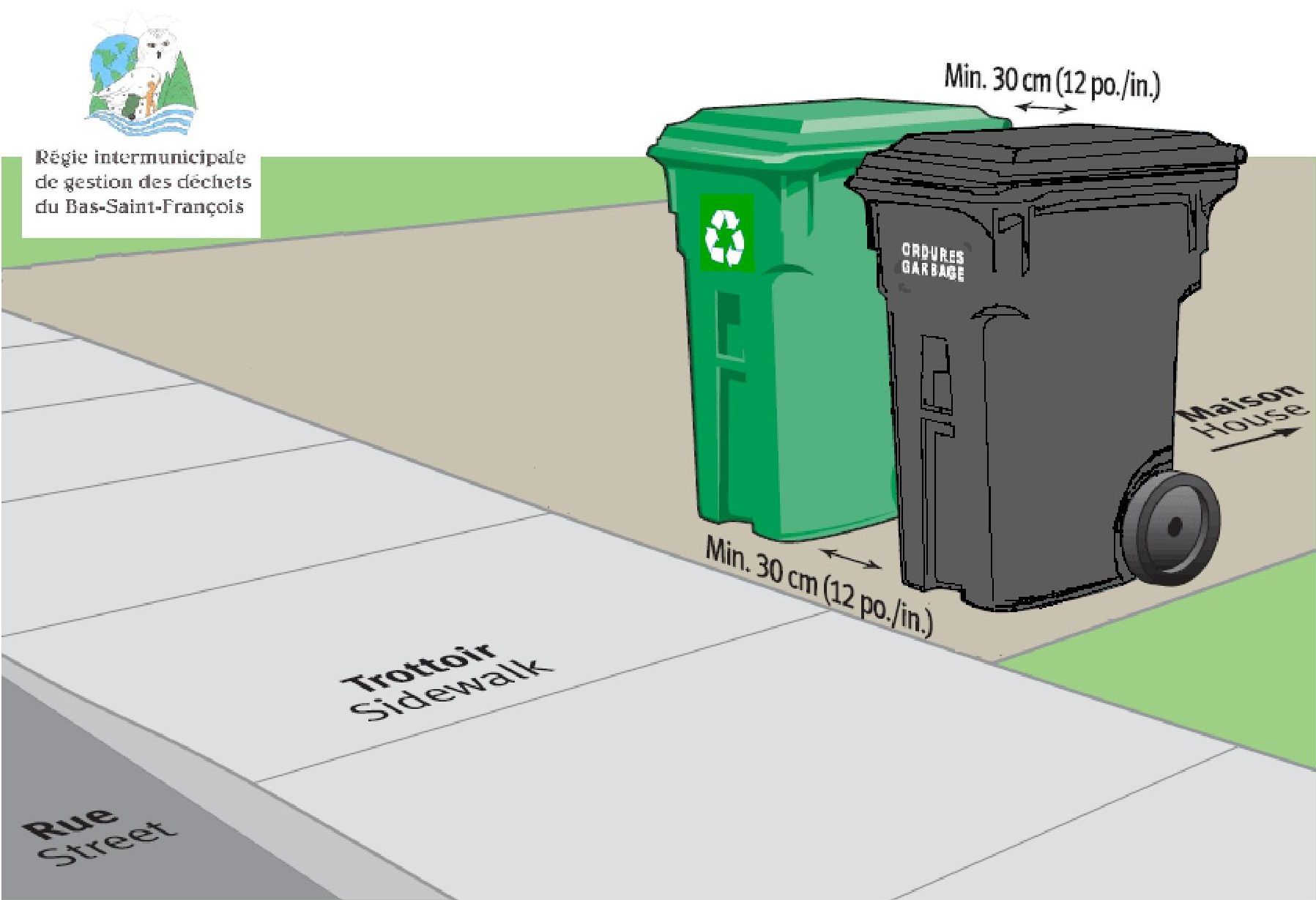- Si vous avez deux bacs à mettre en bordure de la rue, ceux-ci doivent être installés à une distance de 30 cm (12 pouces) l'un de l'autre.